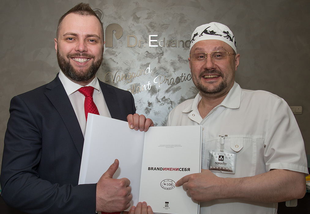 Для познания новых граней в стоматологии и повышения уровня квалификации в наш Учебный центр приглашаются лектора с различными степенями и званиями. Мы выбираем как молодых, подающих надежды докладчиков, но со своими интересными взглядами и подходами, так и именитых, признанных лекторов на общероссийском уровне и международном. И каждый из них достоин уважения. Мы с благодарностью относимся к каждому и поэтому, было принято решение – за привезённые знания дарить особые подарки лекторам. Так, 20 апреля, Сергей Едранов вручил экземпляр с номером 108 эксклюзивного юбилейного издания BRAND ИМЕНИ СЕБЯ Николаю Брусову – молодому, активному и перспективному лектору.