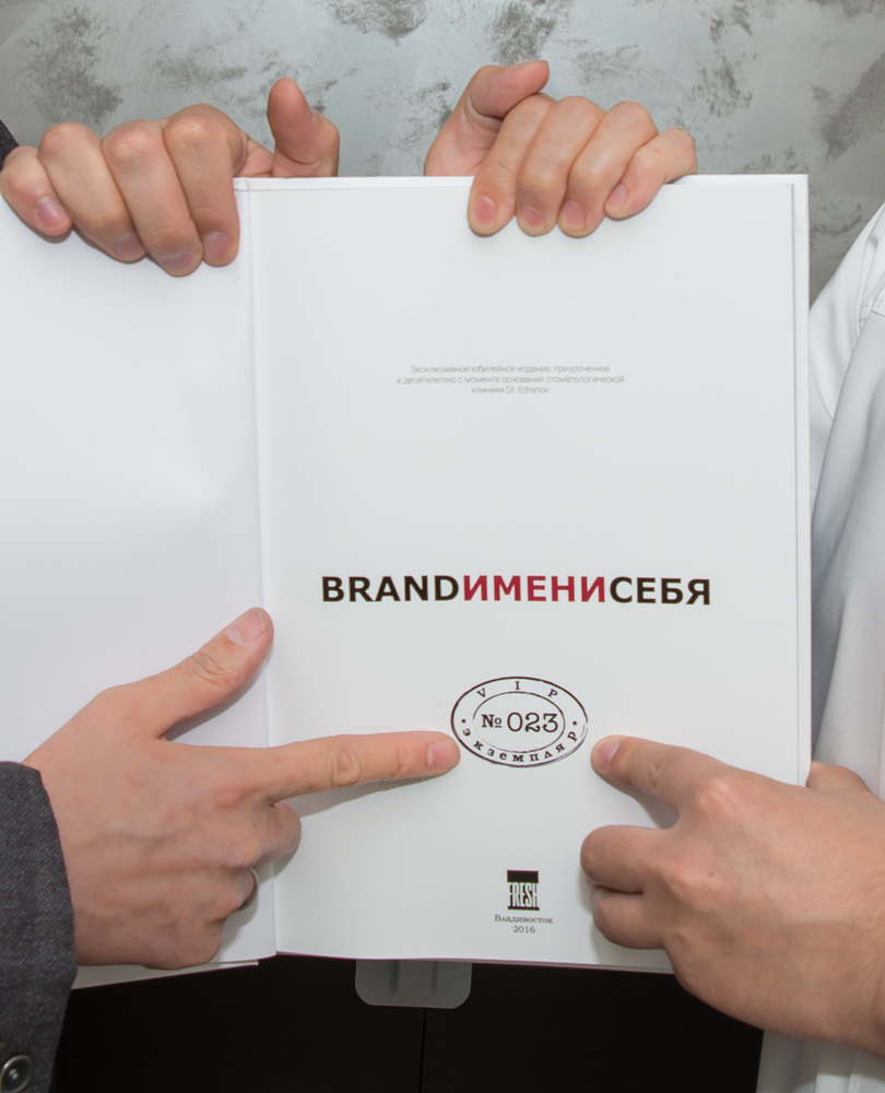 Традиция вручать номера эксклюзивного издания BRANDИМЕНИСЕБЯ уже сложилась в целую историю из теплых встреч и памятных моментов клиники Dr.Edranov. Каждый человек, который приходит в нашу жизнь, появляется в ней не случайно. Каждая встреча – копилка в наш личный жизненный опыт, мы все друг для друга одновременно и учителя, и ученики. Важно помнить, что не каждый человек останется навсегда, но нужно продолжать идти и быть благодарными им за то, что они нам дали. На днях состоялась приятная встреча двух докторов, ранее - партнеров по бизнесу – Сергея Сергеевича Едранова и Валерия Георгиевича Цой. Взаимное уважение – одна из самых ценных форм признания заслуг для каждого специалиста, а так же показатель профессиональной и личностной зрелости. В завершении встречи в знак признательности за годы совместной работы и уважения Доктор Едранов вручил гостю символичный подарок – экземпляр эксклюзивного уникального издания BRANDИМЕНИСЕБЯ с порядковым номером №023.