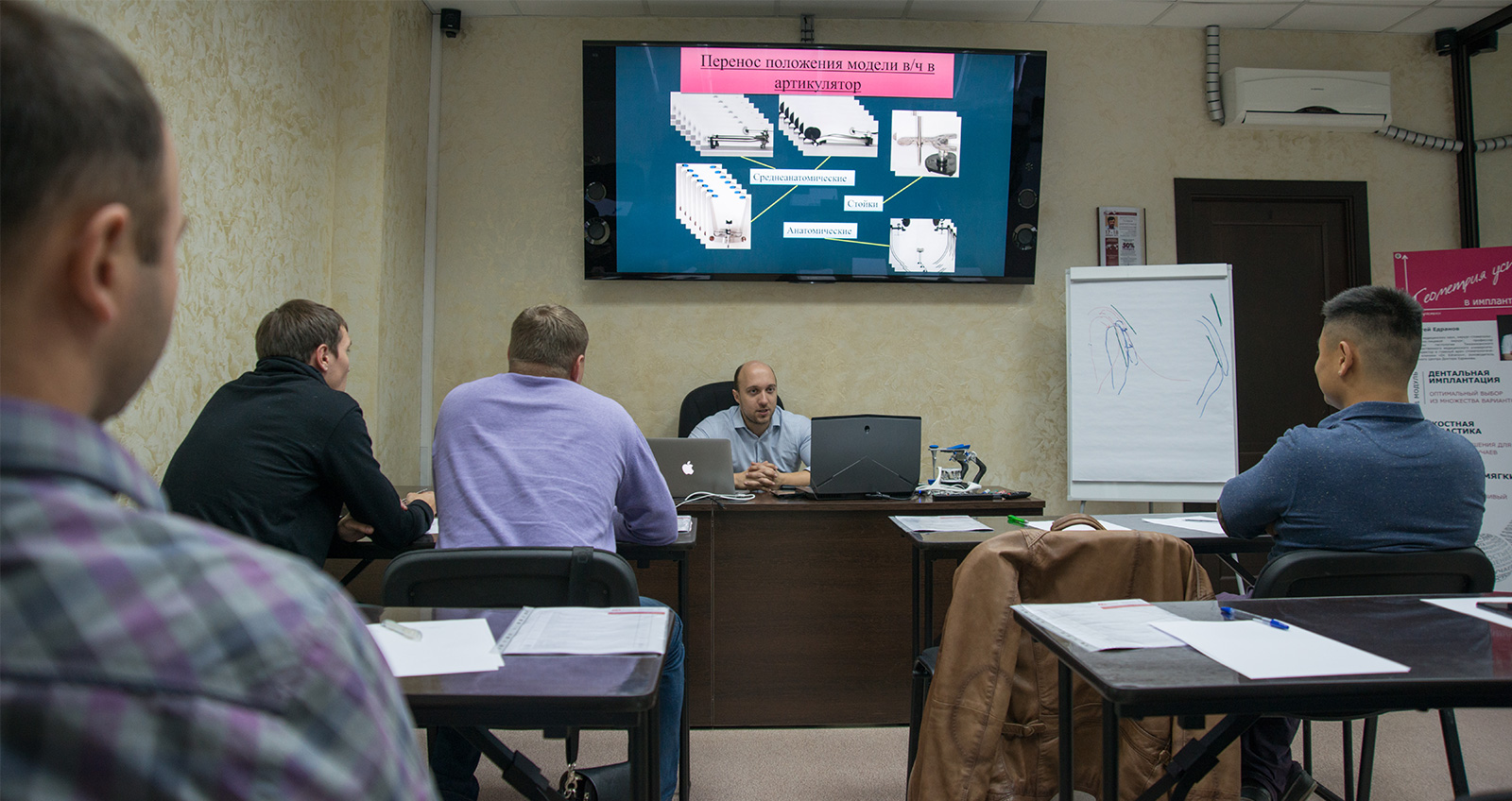 В ходе обучения состоялся мастер-класс, посвященный детальному "знакомству" с оптическим аксиографом и программным обеспечением системы PROSYSTOM. Так, на практической части курса курсанты, с помощью аксиографа записывали и анализировали индивидуальные траектории протрузии и латеротрузии, затем записывали жевательные движения. После этого гипсовали модель верхней челюсти в артикулятор в индивидуальной плоскости.