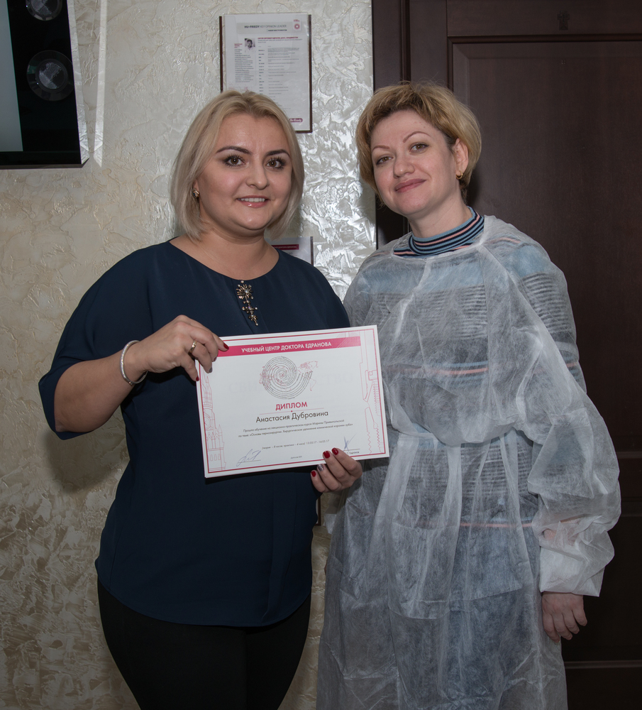 По окончании лекционно-практического курса Марины Приямпольской "Основы периохирургии. Методики хирургического удлинения клинической коронки зуба" традиционно всем слушателям и лектору вручили дипломы, а также каждому был выдан Сертификат с присвоением 12 баллов по НМО.