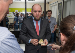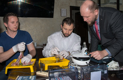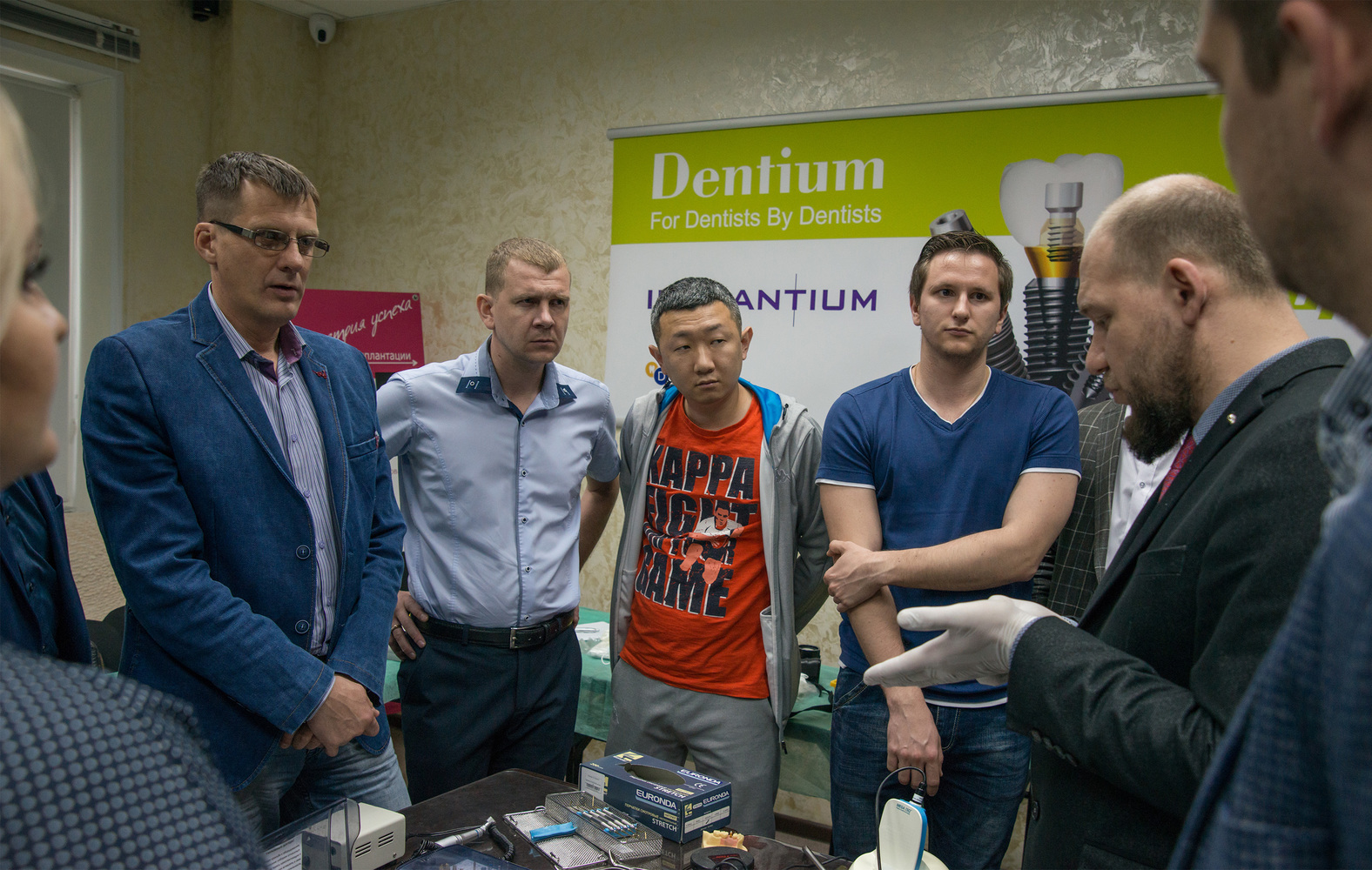 Одновременно с этим, уделили внимание и инструментам. Так, например, щипцы и их разновидности были продемонстрированы аудитории на экране, а также были выданы для наглядности участникам курса. В конце первого дня в рамках обучения состоялось практическое занятие: демонстрация дентальной имплантации одномоментно с синус-лифтингом, с расщеплением и с НКР. Слушатели попрактиковались в отработке полученных знаний на практике. По окончании первого дня обучения, специально для лектора, Камиля Наильевича, менеджер Учебного Центра - Алексей Чеховский, провёл экскурсию по стоматологической клинике Dr. Edranov.
